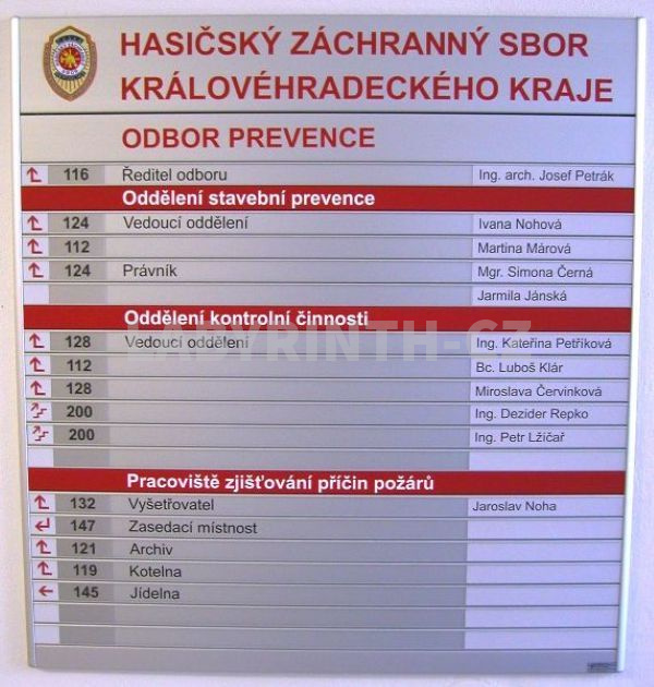 Každá instituce by dnes měla mít vypracovaný Corporate Identity plán. Nejčastěji vyrábíme ze stříbrného eloxu (neoxiduje, je stálobarevný) a plně koresponduje se všemi prvky našeho orientačního systému. Navíc je nehořlavý, nerozbitný a přitom snadno rozebíratelný - texty jdou snadno aktualizovat, výměna se provádí ručně nebo pomocí obyčejného šroubováku a zvládne ji i naprostý laik. Místo skla používáme antireflexivní fólii, takže text je i z úhlu dobře čitelný (neleskne se) a navíc při náhodném pádu nehrozí zranění o střepy.
