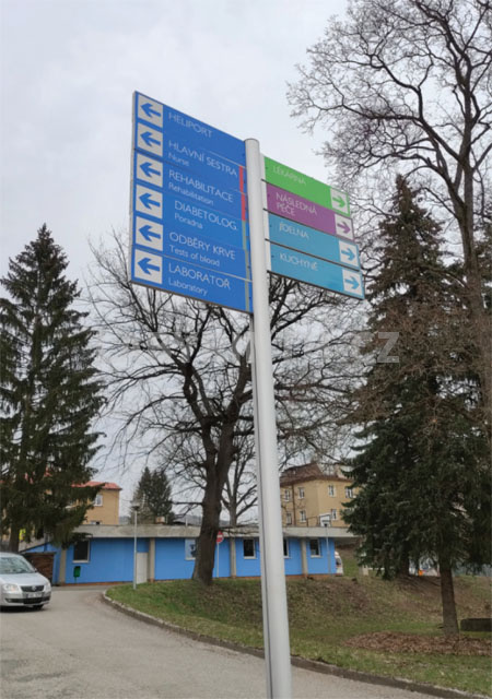 V tomto provedení vyrábíme různé směrovky, informační tabule, orientační a navigační cedule nebo cedulky se šipkou, vč. označení firem, ulic, dočasných nebo stálých akcí apod. Navigační směrovky „přesně na míru” také bývají nedílnou součást městského mobiliáře.
