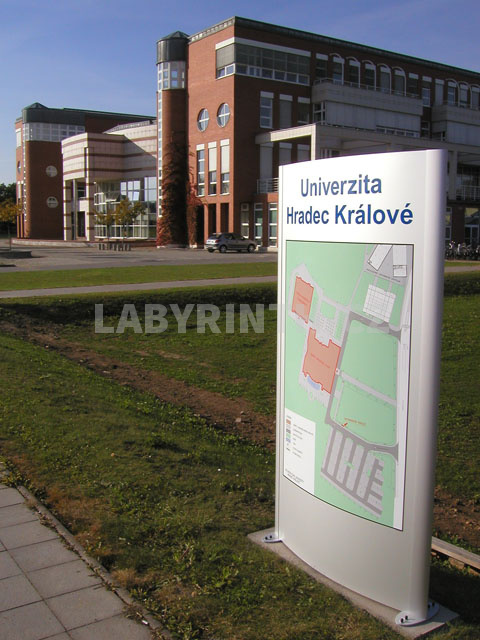Cedule do země (informační tabule, cedule mezi budovami, cedule a tabule do země, plán areálu, mapa, schema)
