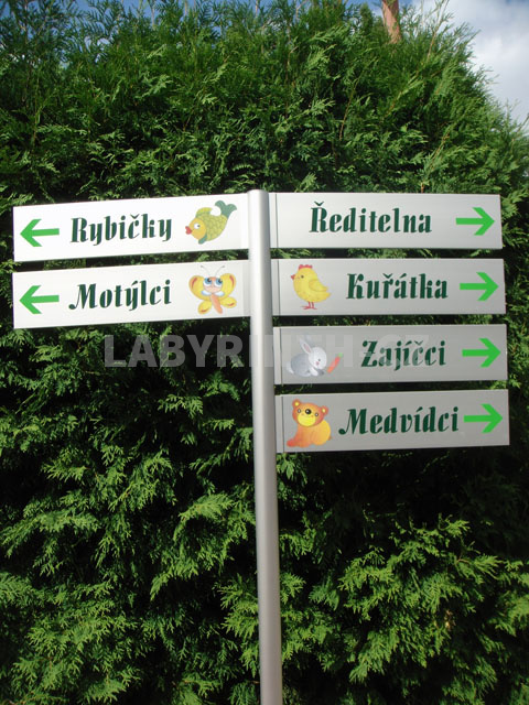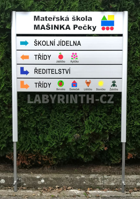 Naše orientační systémy pro školy a školská zařízení (vč. domů dětí a mládeže, domovů mládeže apod.) slouží ke snadné orientaci a aktuální informovanosti ve školských objektech i mimo ně - to vše v jednotném vizuálním i grafickém stylu. Základním výrobním materiálem je hliník s nejčastější povrchovou úpravou stříbrný elox. Výhodou eloxu je jeho prakticky neomezená životnost, „čisté“ provedení a nadčasový design.