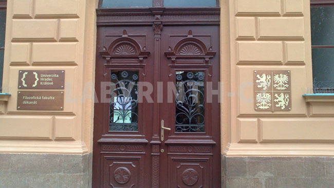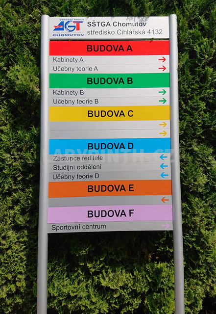 Cedule do budovy (hlavní informační tabule, patrové cedule, směrové tabule a šipky)