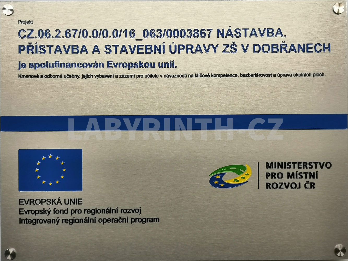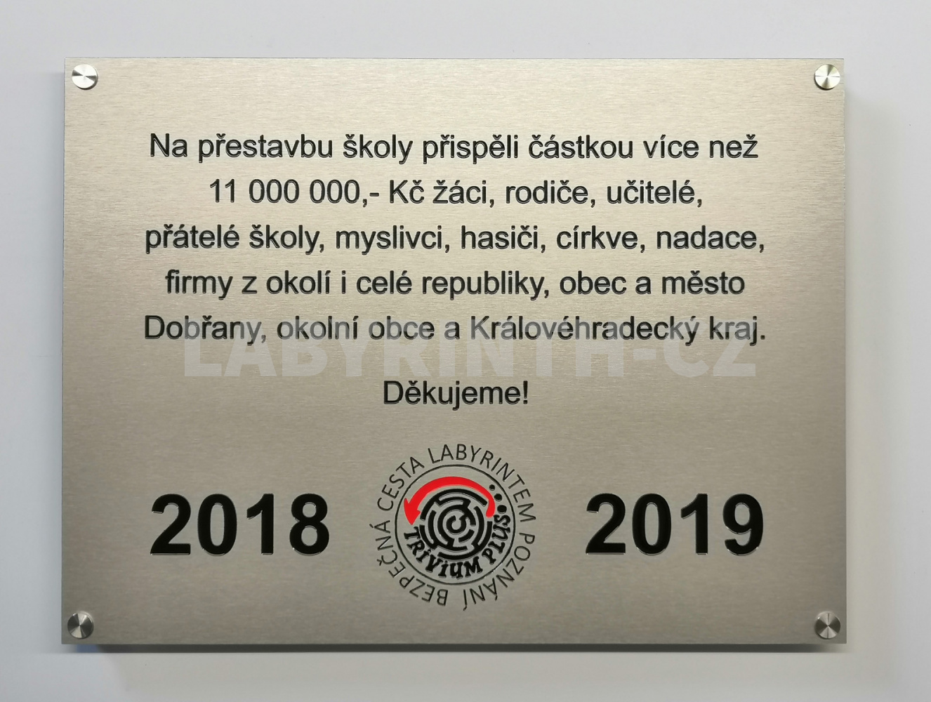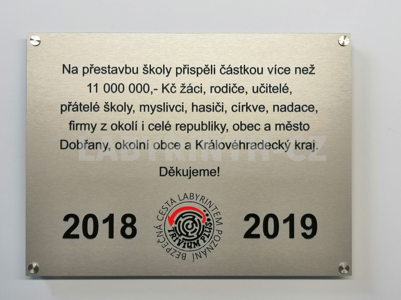 S označeným projektem (při financování např. z dotací EU), základním kamenem k významné stavbě, s informací při poskytnutí daru apod. se setkáváme téměř na každém kroku. Za tímto účelem vyrábíme různé cedule, informační tabule a cedulky, na nichž je uvedena např. povinná publicita. Tyto cedule vyrábíme z vysoce kvalitních materiálů (eloxovaný hliník, broušený hliník, nerez, mosaz apod...). Uplatnění najdou v exteriéru i v interiéru.
