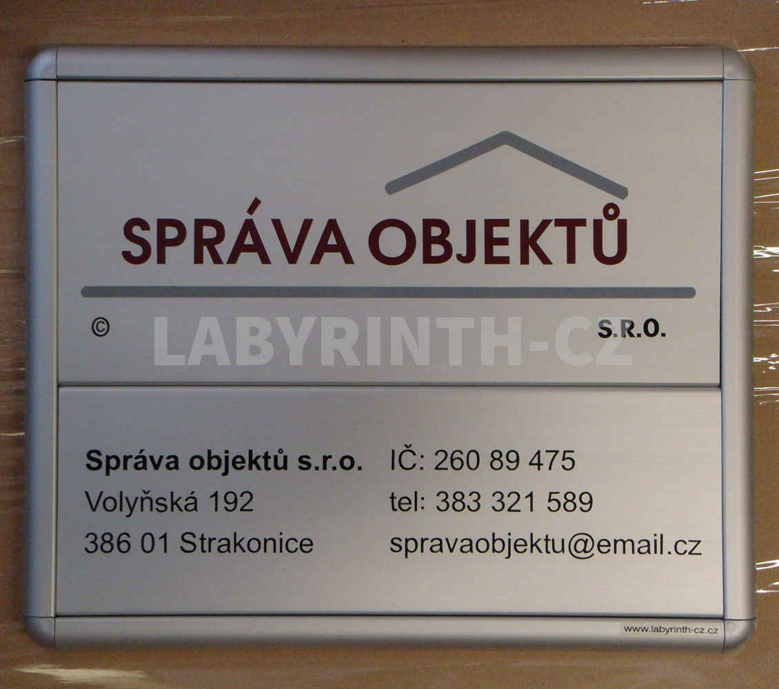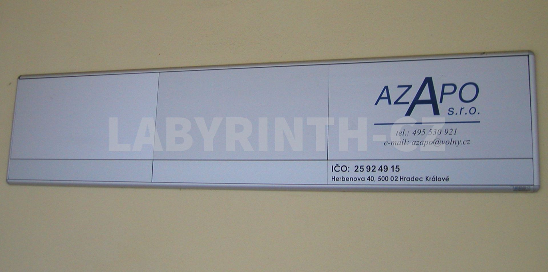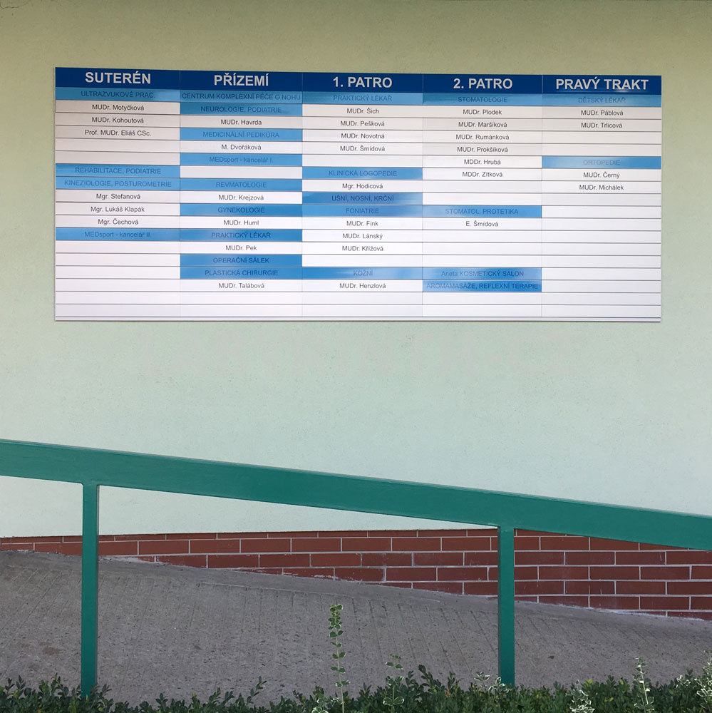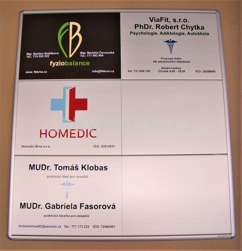 i grafika opravitelné. Jednotlivé „řádky” se u všech informačních tabulí dají snadno zaměňovat za jiné, prohazovat, měnit jejich pořadí nebo doplňovat o nové. Pokud je potřeba starý text nahradit novým (např. do budovy nebo do areálu přibude nová firma), starý nápis se opatrně odstraní (sloupne) a místo něj se nalepí nový. Každá takováto změna u všech námi vyráběných informačních a orientačních tabulí a cedulí je snadná, rychlá a navíc s minimálními náklady, neboť původní hliníková konstrukce zůstává beze změny.