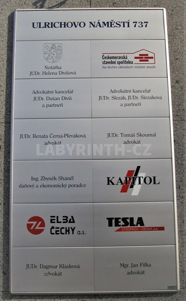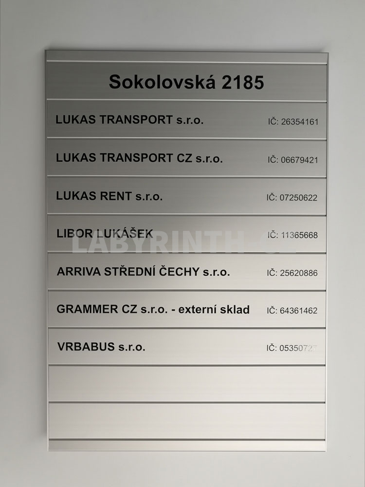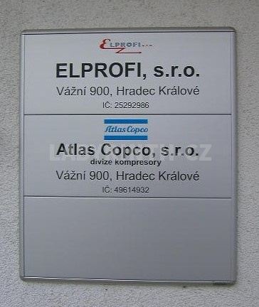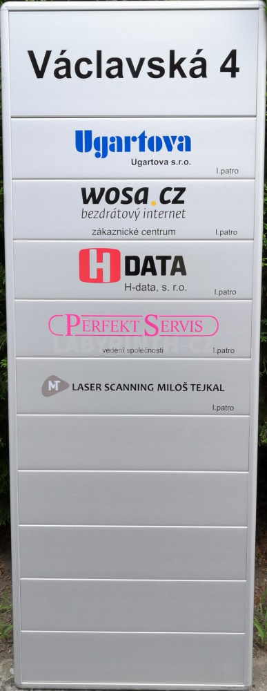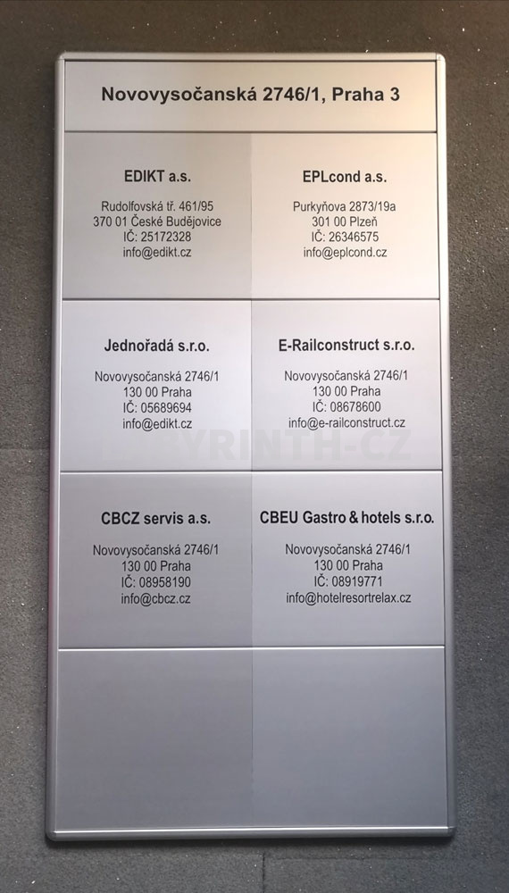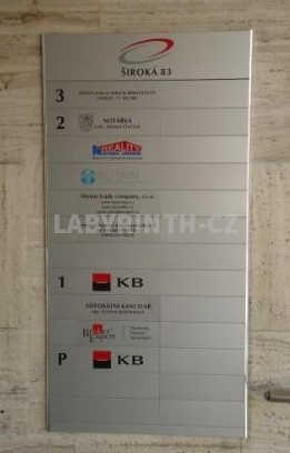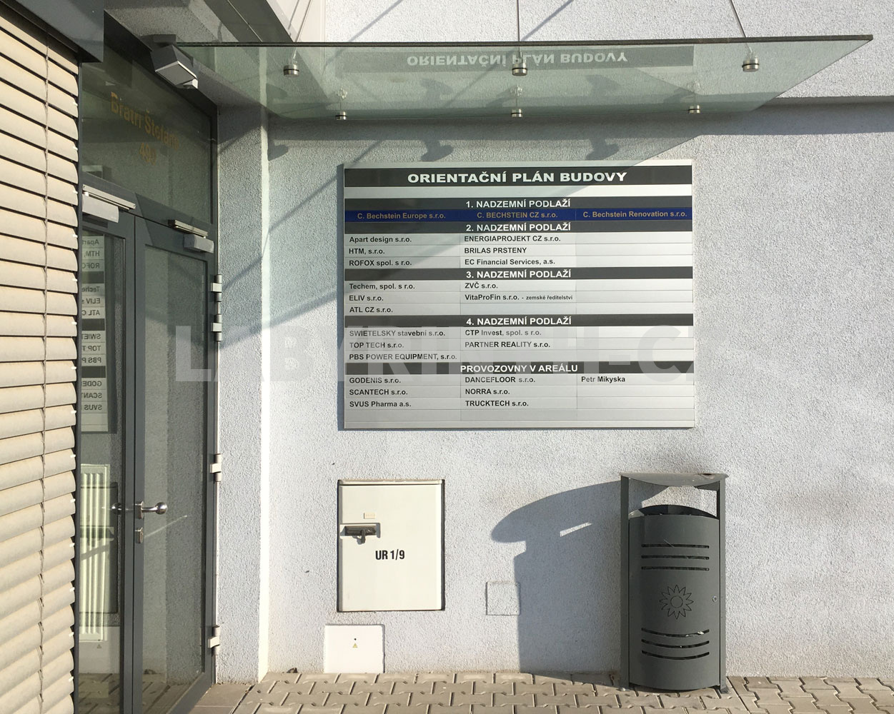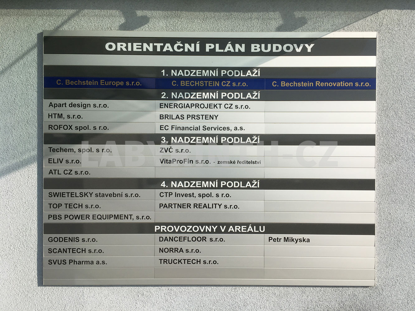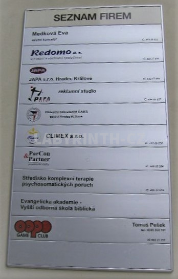 Seznam firem v budově (cedule na budovu, přehled firem v budově, označení sídel firem)