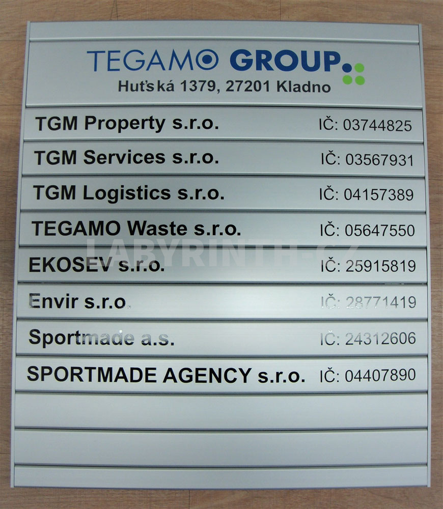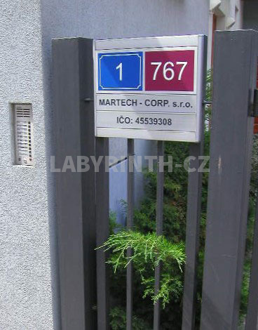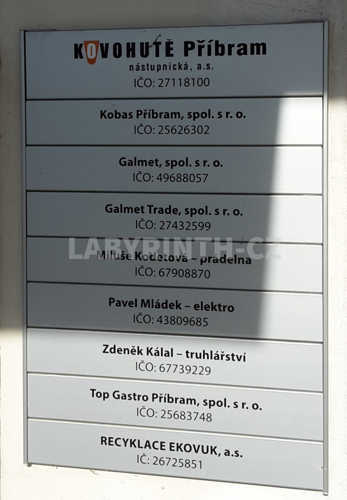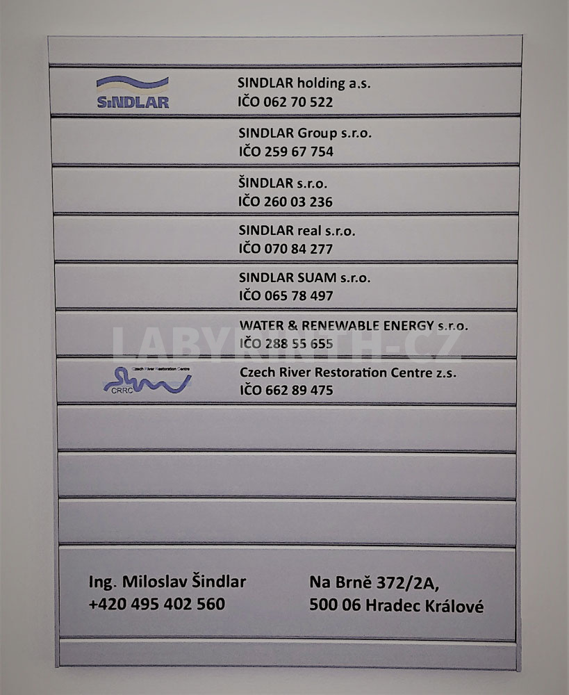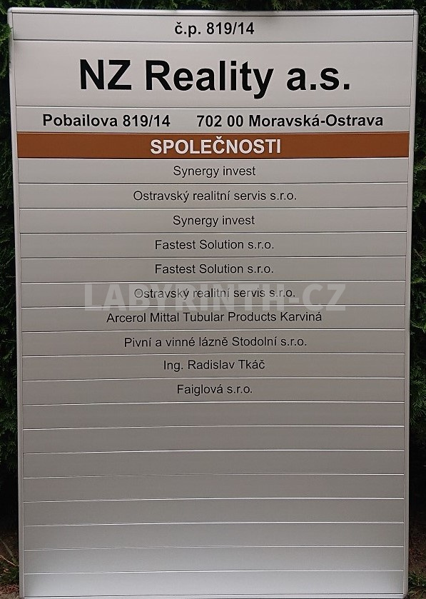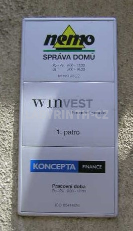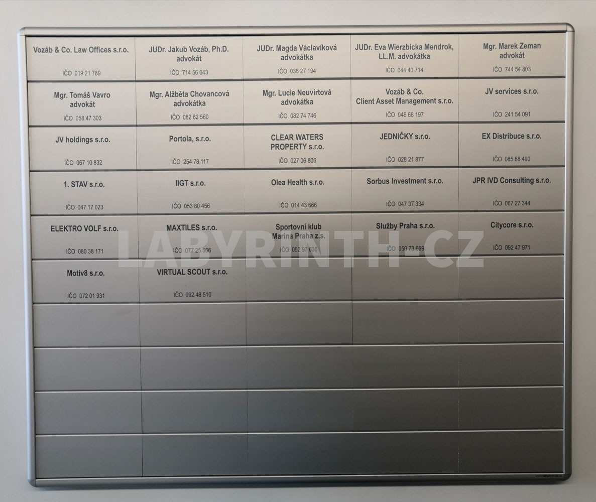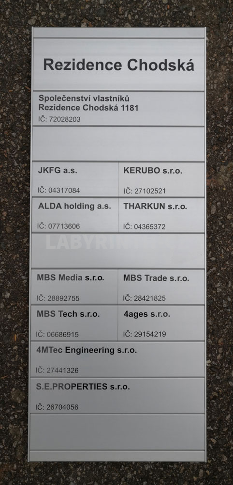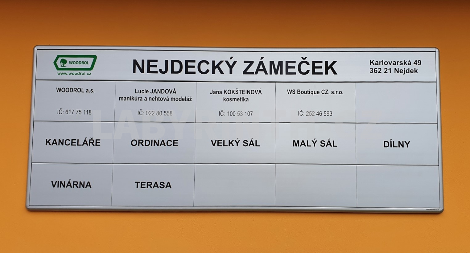 Seznam firem v budově (cedule na budovu, přehled firem v budově, označení sídel firem)