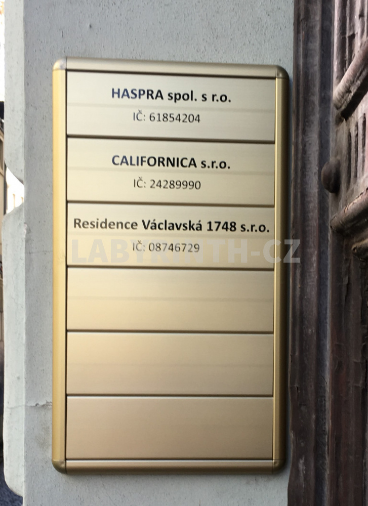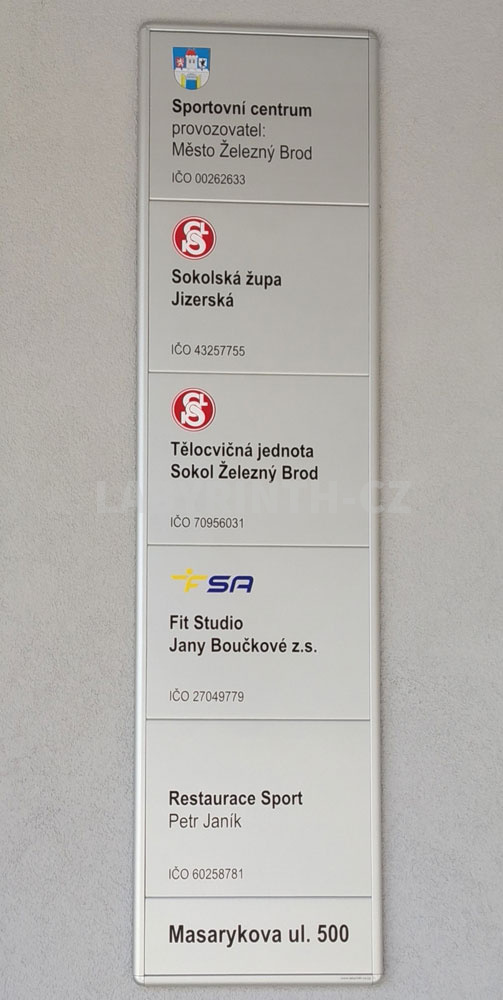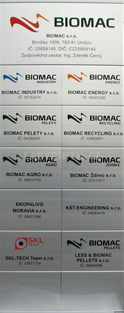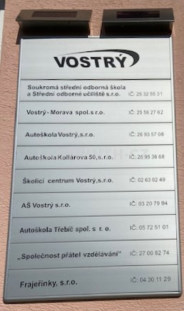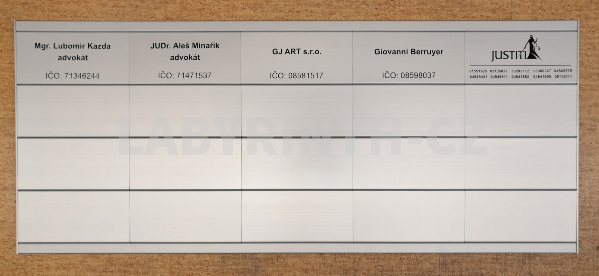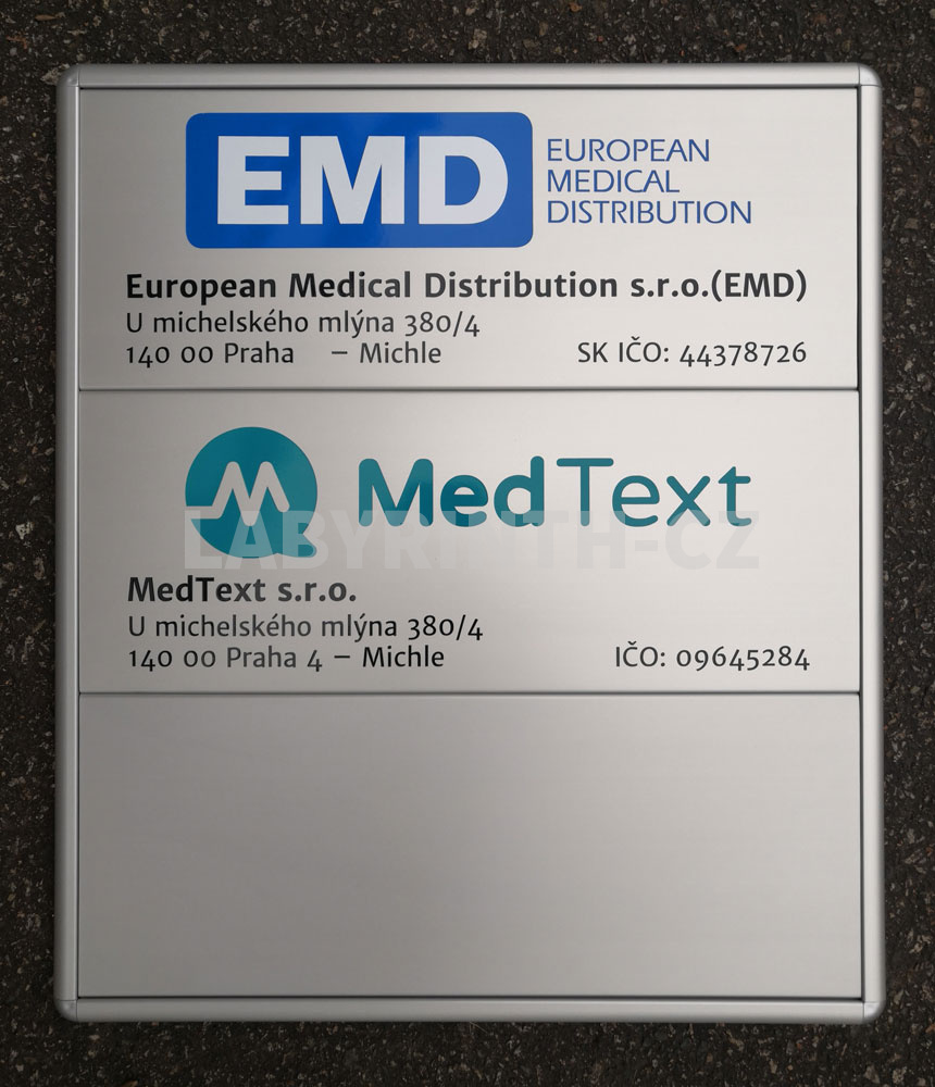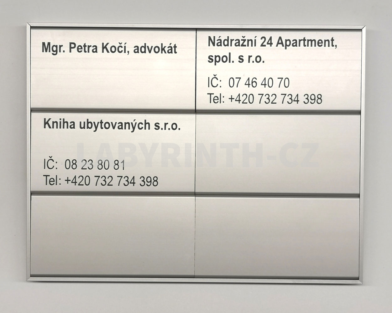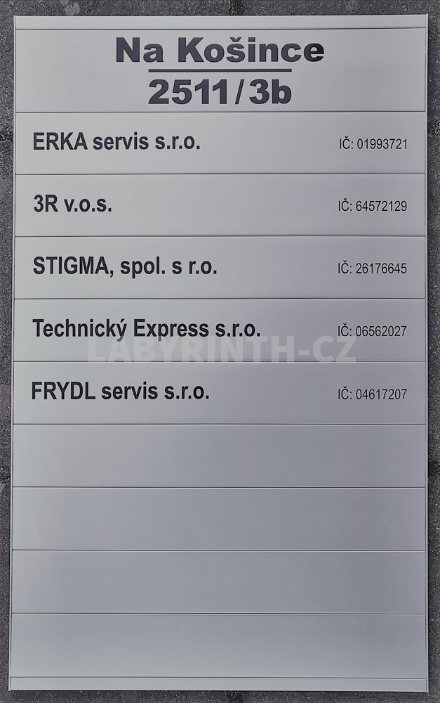 Seznam firem v budově (cedule na budovu, přehled firem v budově, označení sídel firem)