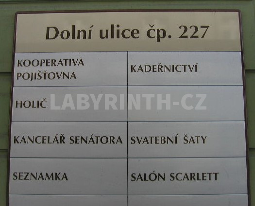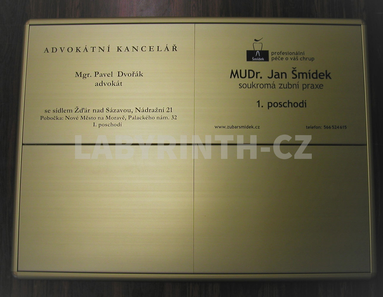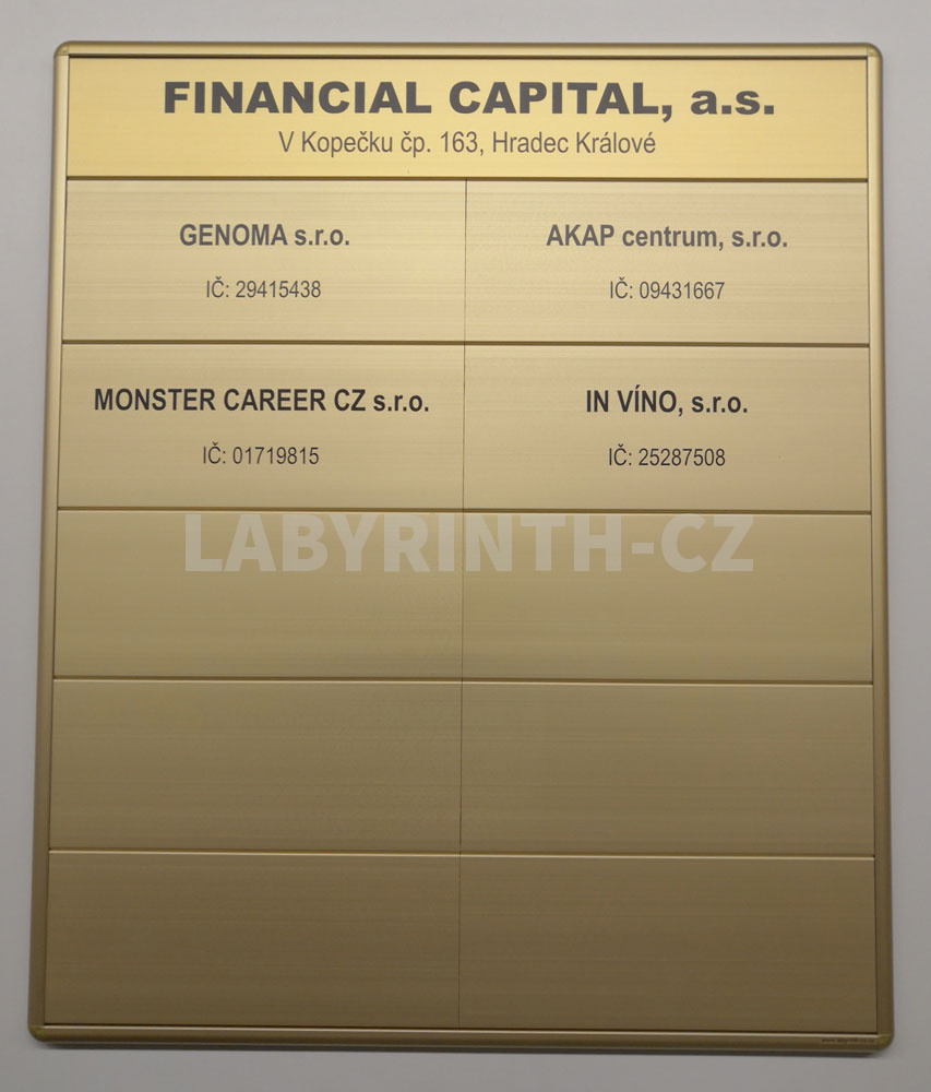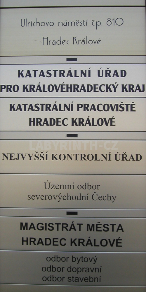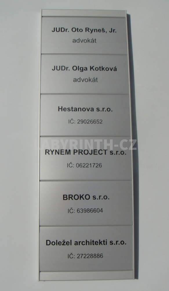 V mnoha budovách se pronajímají prostory k podnikání. A každá firma v této budově musí být ze zákona označená. Na takovéto budovy vyrábíme cedule, které obsahují seznam nájemníků (firem) sídlících v budově. Informační tabule může obsahovat libovolný počet „políček” (štítků), přičemž každé „políčko” připadá jedné firmě. Štítek pro jednu firmu může obsahovat (kromě povinných údajů) logo nebo i jiné údaje - vše na přání zákazníka.