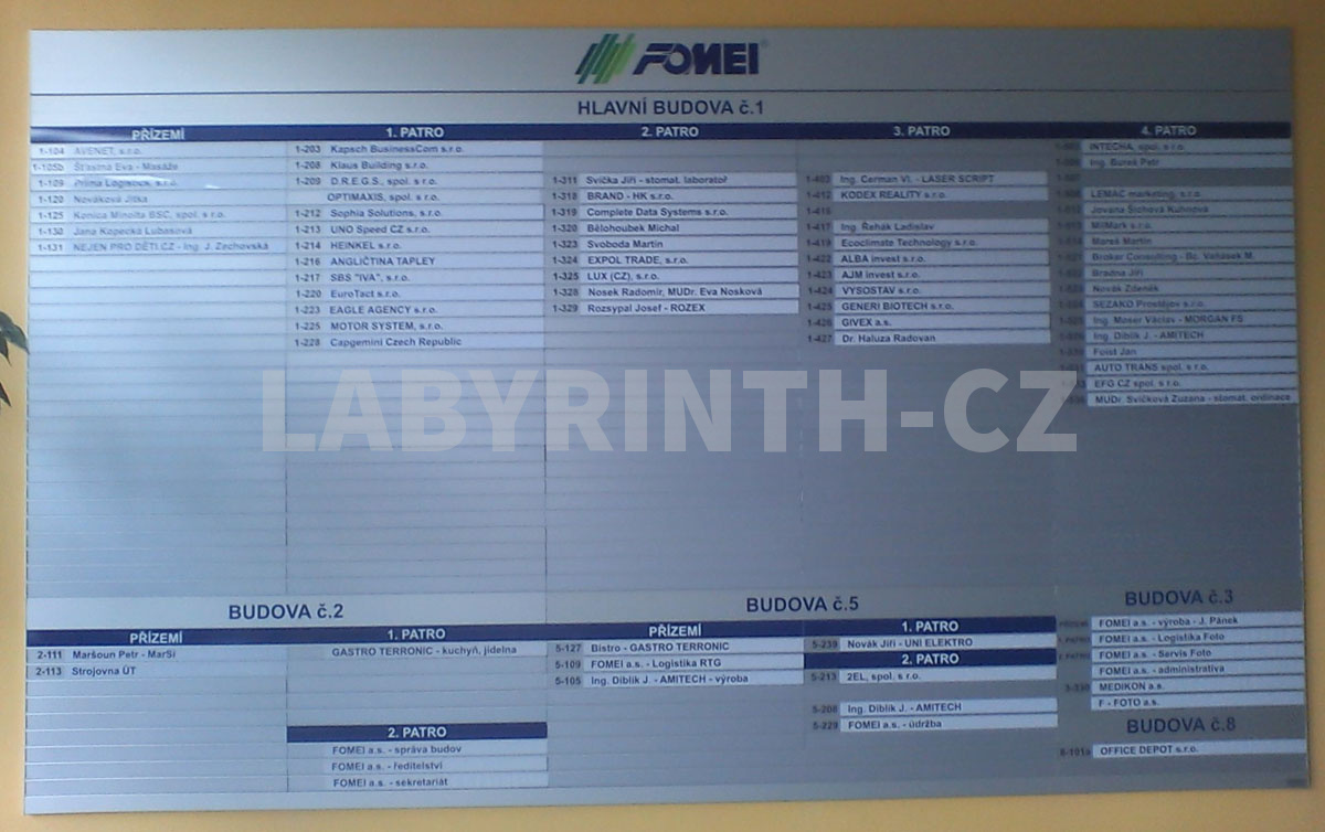 Ve vstupních prostorech, halách, se většinou nachází tzv. hlavní (centrální) informační cedule. Obsahuje základní informace o struktuře daného objektu. Členěna bývá většinou po patrech, příp. po budovách, pokud jsou třeba průchozí. Dále tyto cedule obsahují základní nadpis, firemní logo, znak obce, půdorysy, oddělení, funkce, jména pracovníků a další potřebné infomace. Právě jména či jiné častěji měnicí se údaje umisťujeme do hliníkových profilů (lamel) s drážkou pro jejich snazší výměnu a s možností vlastního tisku.