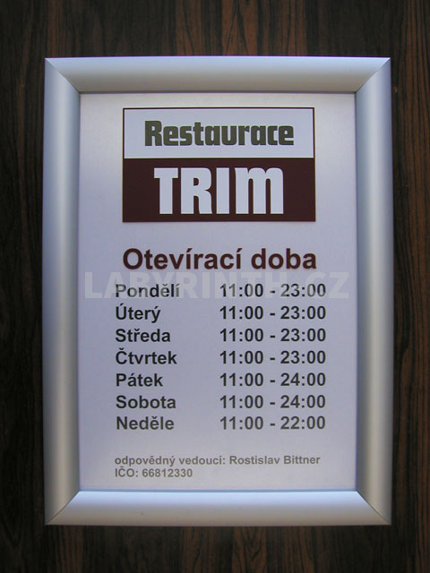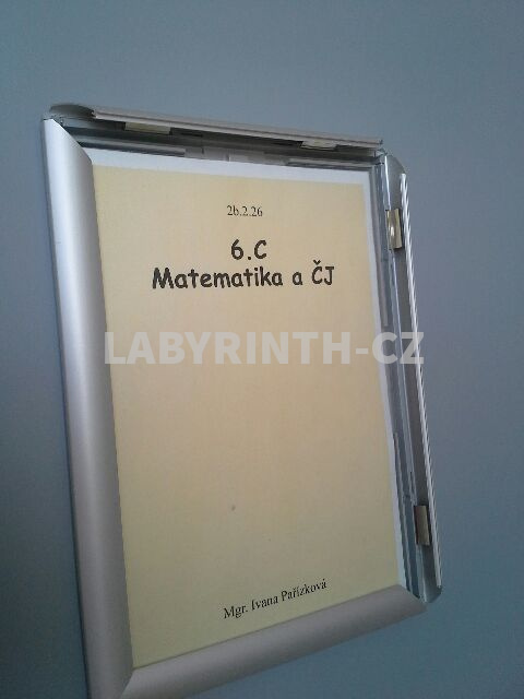 Vyklapávací rámy a lišty - Jsou situace, kdy je potřeba některé informace často měnit a přitom je elegantně do něčeho umístit: k těmto účelům slouží tzv. vyklapávací hliníkové rámy. V praxi se využívají buď jako samotné lišty, tzv. vzkazovníky (umístěné např. pod kancelářský štítek pro různé vzkazy a informace – „Přijdu hned“ apod.), nebo jako vyklapávací rámy. Výměnu lze provádět velice snadno rukou a to bez použití jakéhokoli nářadí. Na přání zákazníka lze vyrobit i rám, který lze vyklapnout pouze za pomoci speciálního „klíče“ a informace jsou tak chráněné proti odcizení. Samozřejmostí jsou kromě běžných rozměrových řad (formát A4, A3, A2 apod.) i individuální rozměry hliníkových rámů přesně na vaše přání.