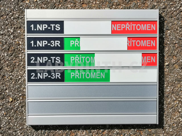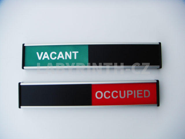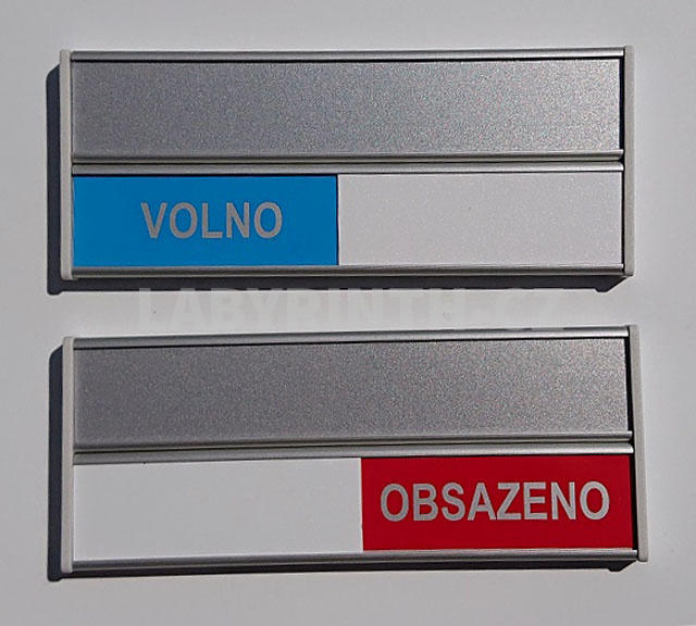 Cedulka VOLNO-OBSAZENO je velice oblíbená. Jednoduchým posunutím "šoupátka" ihned vidíte, zda je místnost volná nebo obsazená. Tato cedulka může být součástí dveřní cedulky (zasedací místnost, WC, koupelna apod.) nebo zcela samostatně. Cedulku je samozřejmě možné vyrobit i v tzv. "firemních" barvách nebo individuálně na zakázku.