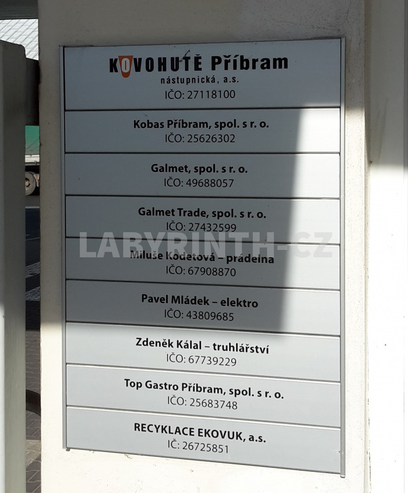 Označení firmy, stříbrný eloxovaný hliník, nelamelové provedení (cedule na budovu)