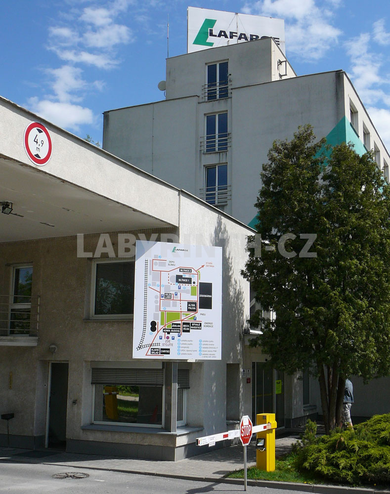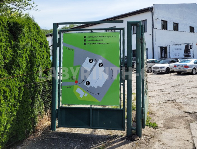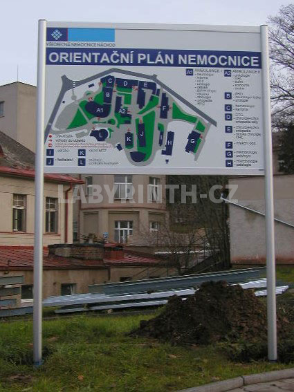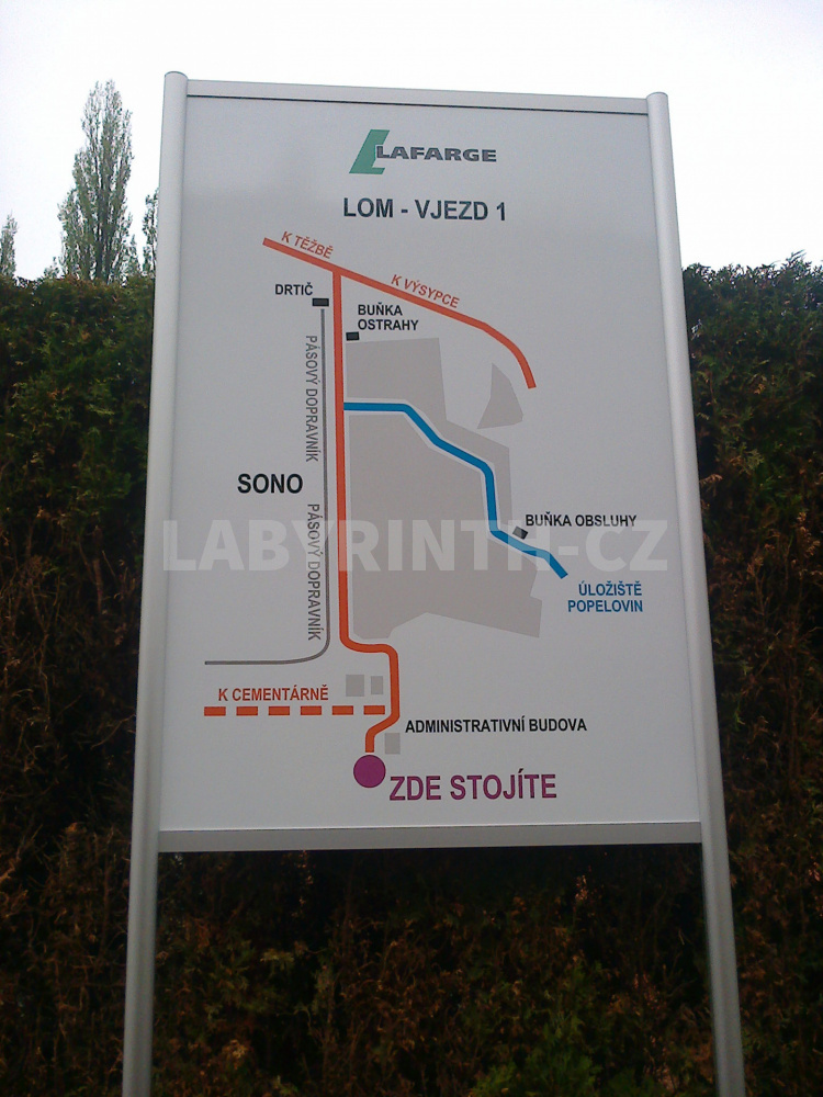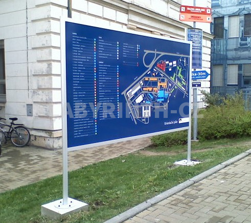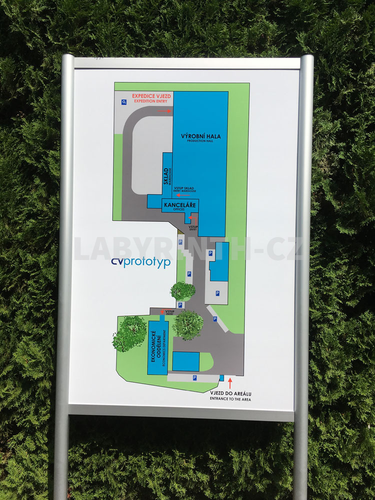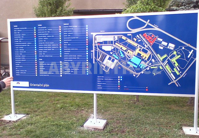 Plány areálů, mapy (schéma areálu, cedule do země, mezi budovy, do exteriéru)