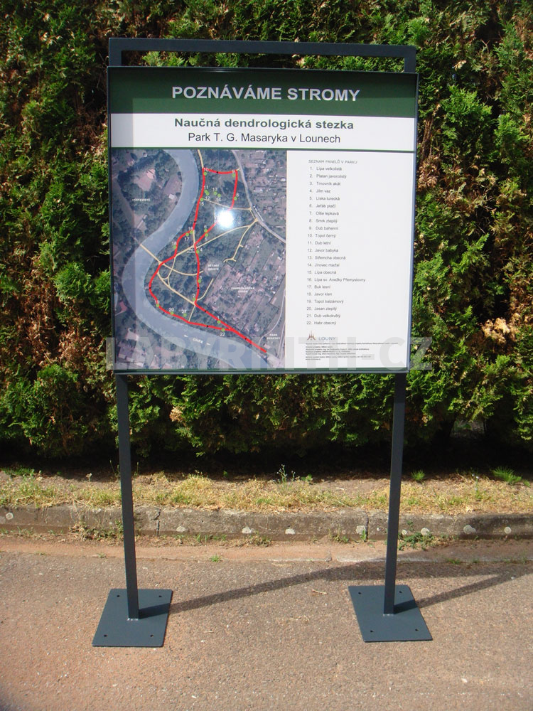 | Materiál: | základní konstrukce (rám) - profilovaný hliník (lamely, stojny), podkladová deska pro umístění plánu areálu |